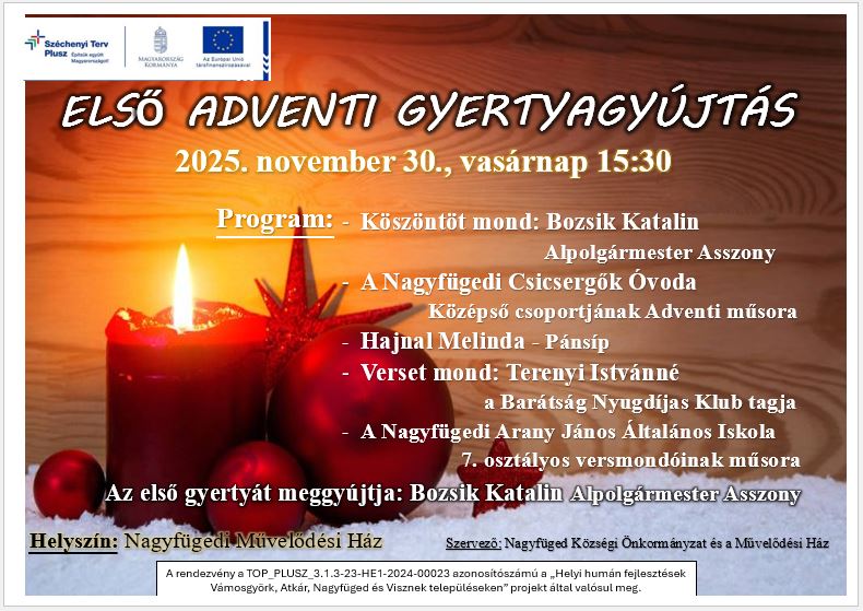 Első adventi gyertyagyújtás 2025. 11. 28 Helyi humán fejlesztések Vámosgyörk, Atkár, Nagyfüged és Visznek településeken Programok Nagy szeretettel vár mindenkit a rendezvényre a település önkormányzata